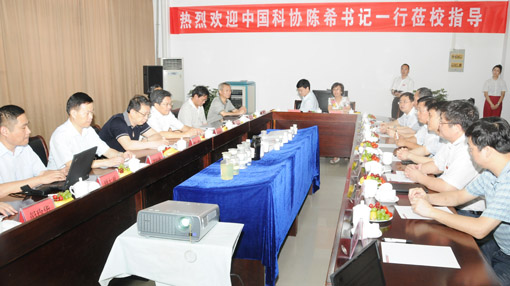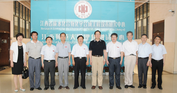 来到方荫楼四区的化学化工学院,陈希一行深入科研实验室实地参观,了解科技工作者研发及大型仪器设备使用等情况。在一楼会议室举行的座谈会上,陈绵水代表学校对陈希一行莅校考察、指导工作表示热烈欢迎,对陈希长期以来对江西师大发展所给予的关心支持表示感谢,他并简要介绍了学校历史沿革、学科建设、科研工作、"十二五"期间实现"保二争一"奋斗目标等方面的情况。廖维林就所从事的研发领域、科研团队,特别是石油加工精细化学品、医药精细化学品、特种精细化学品的研制及科技成果转化应用等,向陈希一行进行了汇报,廖维林强调,只有"产-学-研-用"四位一体相结合,科技工作者才能在创业创新之路上科学发展。