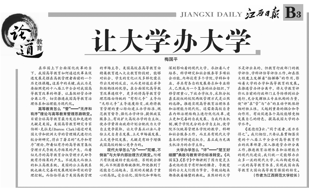 4月22日,《江西日报》教育版“论道教育”专栏刊发了我校校长梅国平教授的理论文章——《让大学办大学》,全文如下: