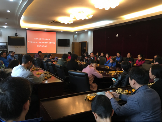 11月12日,江西师范大学留学人员联谊会在东华理工大学会议室开展了“学习系列讲话,加强自身建设”主题学习会,会议由留联会秘书长胡平凡主持,留联会副会长陈祥树、欧阳楚英、倪才英,副秘书长汪莉、姚宝骏等11个学院共四十余位留联会成员参加了学习活动。