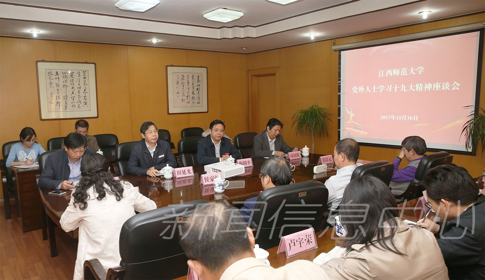 10月30日下午,学校在青山湖校区指挥塔楼四楼会议室召开党外人士学习党的十九大精神座谈会,传达学习全省领导干部会议精神,部署我校党外人士学习宣传贯彻党的十九大精神工作。校党委书记田延光,全国人大代表、民进江西省委副主委、校长梅国平,党委副书记刘光华、副校长项国雄出席。学校各民主党派及统战团体负责人参加学习。