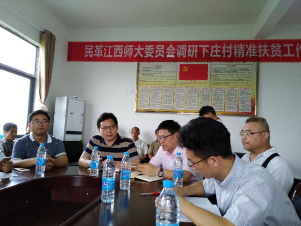 5月18日,民革江西师大委员会主委蒋九愚、副主委王敏带领调研组前往安义县万埠镇调研精准扶贫工作,重点调研下庄村脱贫攻坚工作。上午9:30,调研组在下庄村召开了该村精准扶贫工作座谈会,万埠镇镇长陈勇春、常务副镇长吴兴发、挂职下庄村第一书记丁国友、下庄村各村民小组组长以及贫困户代表参加了座谈会。