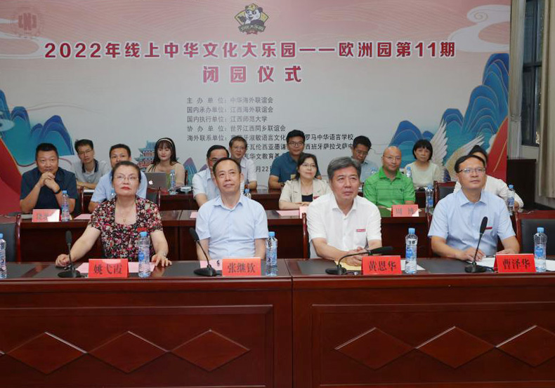 7月22日下午,2022年线上中华文化大乐园—欧洲园第11期闭园仪式在瑶湖校区方荫楼中顺报告厅举行。省委统战部副部长、省政府侨务办公室主任张继钦,校党委书记黄恩华,校党委委员、副校长姚弋霞,校党委委员曹泽华出席。